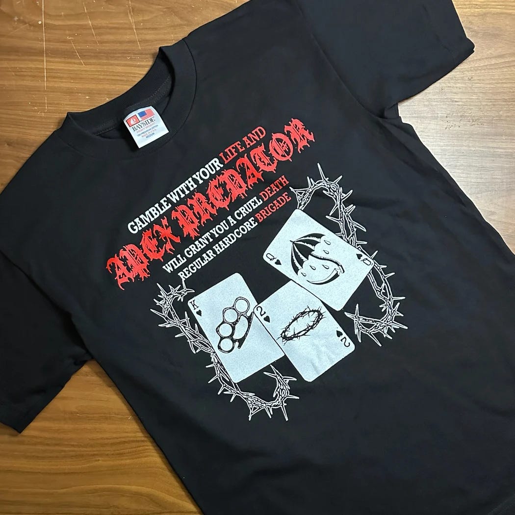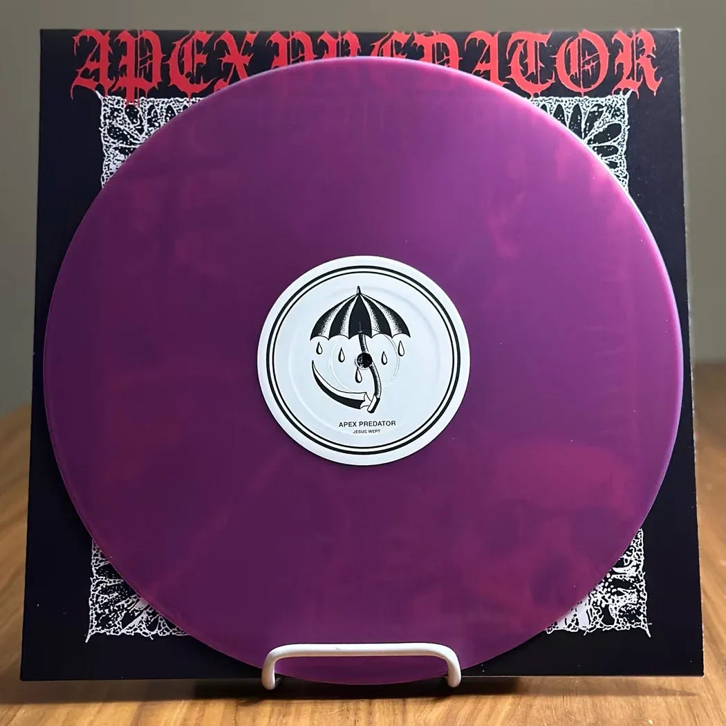 Timely is not something I am exactly awesome at but I try my best to focus on the act of getting around to things as being sufficient. As a millennial I know I am stricken with an avoidant nature that is certainly maddening for everyone who for some reason relies on me for things. Big procrastinators us millennials so I try my best to show patience with everyone that takes forever to make good on things in regards to me in the hopes that sort of grace will be reciprocated. Whether it is or is not, at the end of the day that's not up to me so I can only appreciate when it is and try to forgive when it isn't. That being said I am extremely forgiving of myself when I suffer from my own procrastination. I feel like this was the best round about way to say that I meant to do this weeks ago closer to when the 2nd press of the Apex Predator 12" went live but that clearly didn't happen so like most things I set my mind to I got around to it eventually. There is also a really sick and stupid shirt in the store from them so yeah buy it or look at it or ignore it completely who gives a shit.